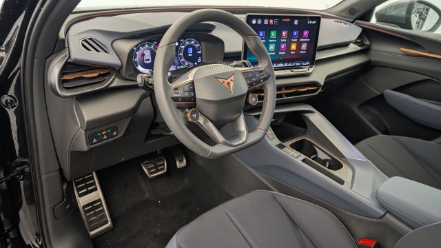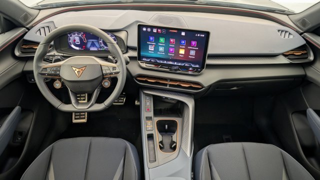 Design Intérieur Deep Ocean (sièges baquets TEP + textile Bleu Acier) - Logos CUPRA estampés sur les appuie-têtes - Planche de bord bleu acier texturée avec aérateurs cuivrés - Contre-portes en TEP noir texturé - Ciel de pavillon noir - Sièges conducteur et passager avec réglage manuel en hauteur et lombaire