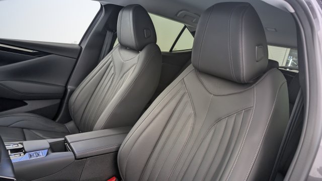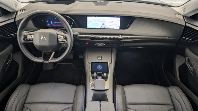 Sellerie en Cuir grainé Noir Basalte et Toile DS Parties centrales des sièges AV, partie centrale des sièges latéraux AR et partie AV des appuie-tête en cuir. Bourrelets latéraux des sièges AV, accoudoir central et siège central AR, et parties latérales et AR des appuis tête en Toile DS.