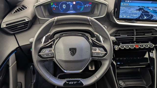 Volant compact cuir fleur avec commandes multimédia intégrées et badge GT